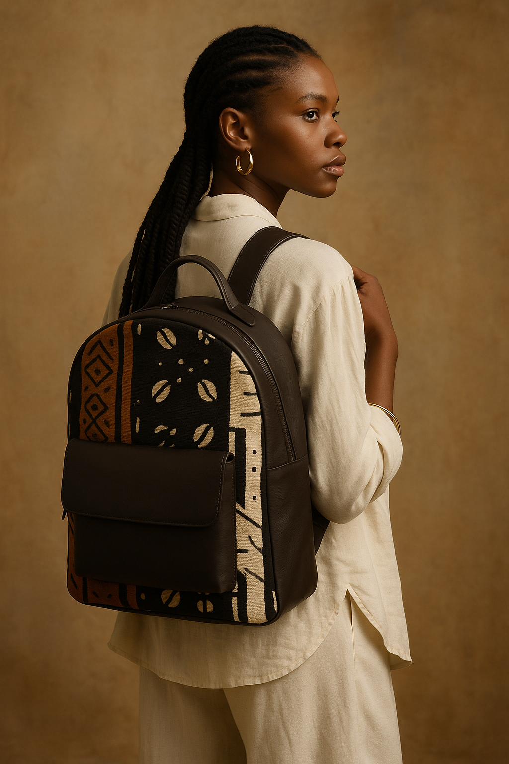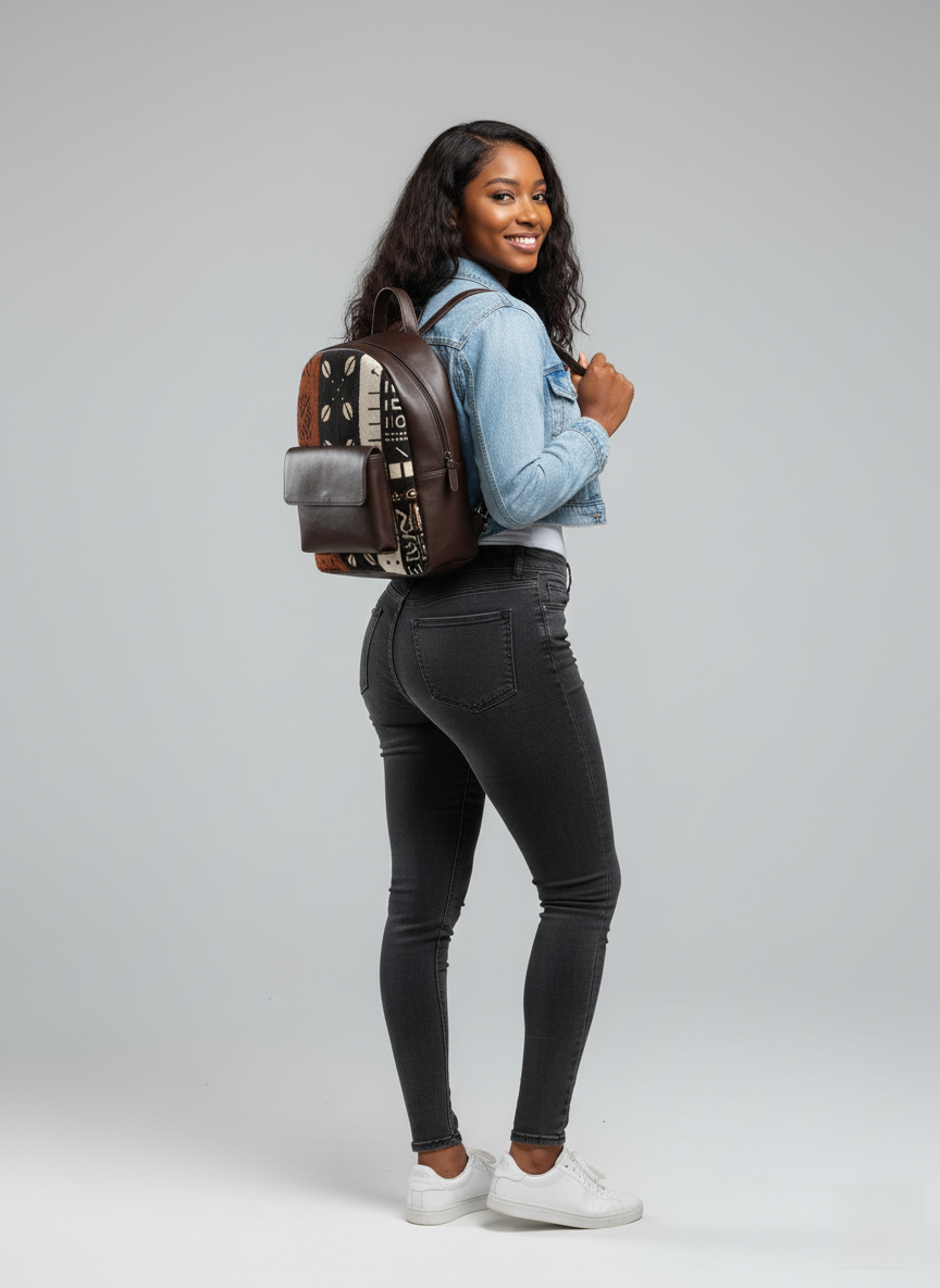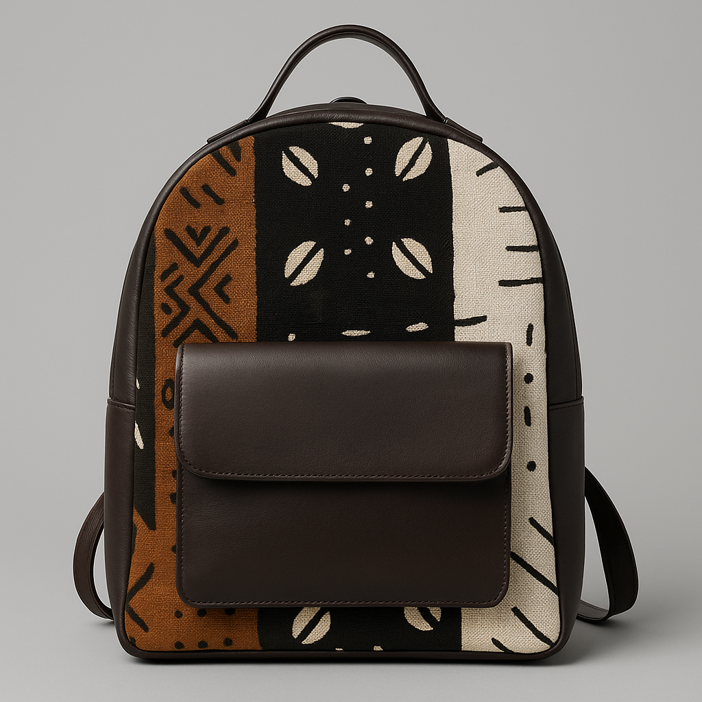 Découvrez ce sac à dos alliant élégance et authenticité : sa structure en cuir pleine fleur marron profond s’associe à un bogolan tissé de motifs ethniques inspirés du mud cloth africain. Conçu pour les citadins exigeants, il offre une poche avant à rabat sécurisé ainsi qu’un grand compartiment principal zippé, idéal pour accueillir ordinateur, documents et effets personnels. Les bretelles réglables et le dos matelassé garantissent un confort optimal tout au long de la journée. Finitions soignées, surpiqûres contrastantes et doublure intérieure résistante complètent ce modèle haut de gamme, parfait pour sublimer votre style urbain en toute occasion.
